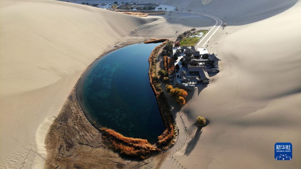 11月6日在甘肅省敦煌市鳴沙山月牙泉景區拍攝的秋景(無(wú)人機照片)。