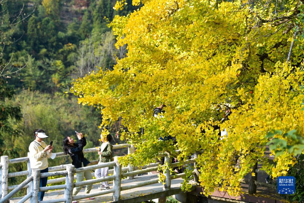 11月6日,游客在貴州省貴陽(yáng)市烏當區羊昌鎮黃連村的古銀杏樹(shù)下拍照。