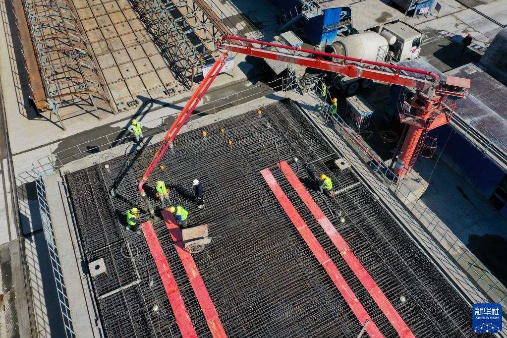 11月7日,中國鐵建大橋局池黃鐵路黃山制梁場(chǎng)施工人員在最后一榀箱梁澆筑現場(chǎng)施工(無(wú)人機照片)。