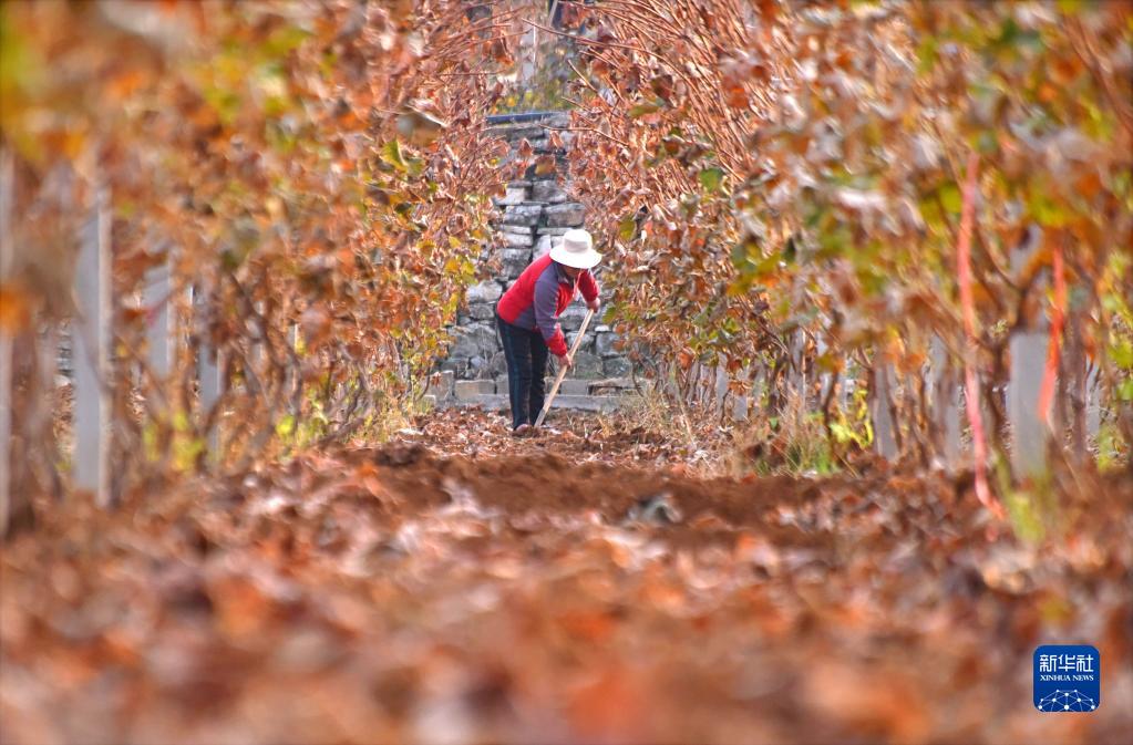 11月7日,山東省淄博市沂源縣悅莊鎮下龍巷村農民在葡萄田間勞作。