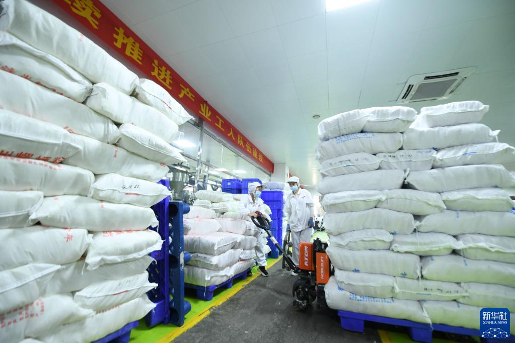 11月7日,在柳州螺螄粉生產(chǎn)集聚區廣西善元食品有限公司生產(chǎn)車(chē)間,工人在搬運材料。