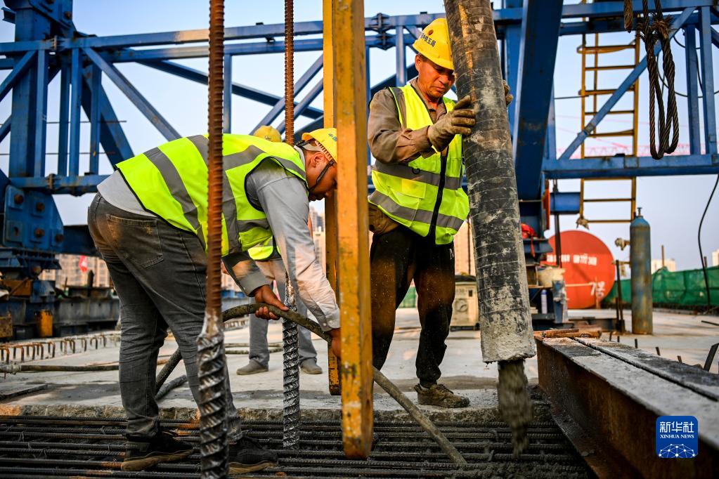11月7日,在廣西崇左麗江大橋建設現場(chǎng),工人在進(jìn)行混凝土澆筑作業(yè)。