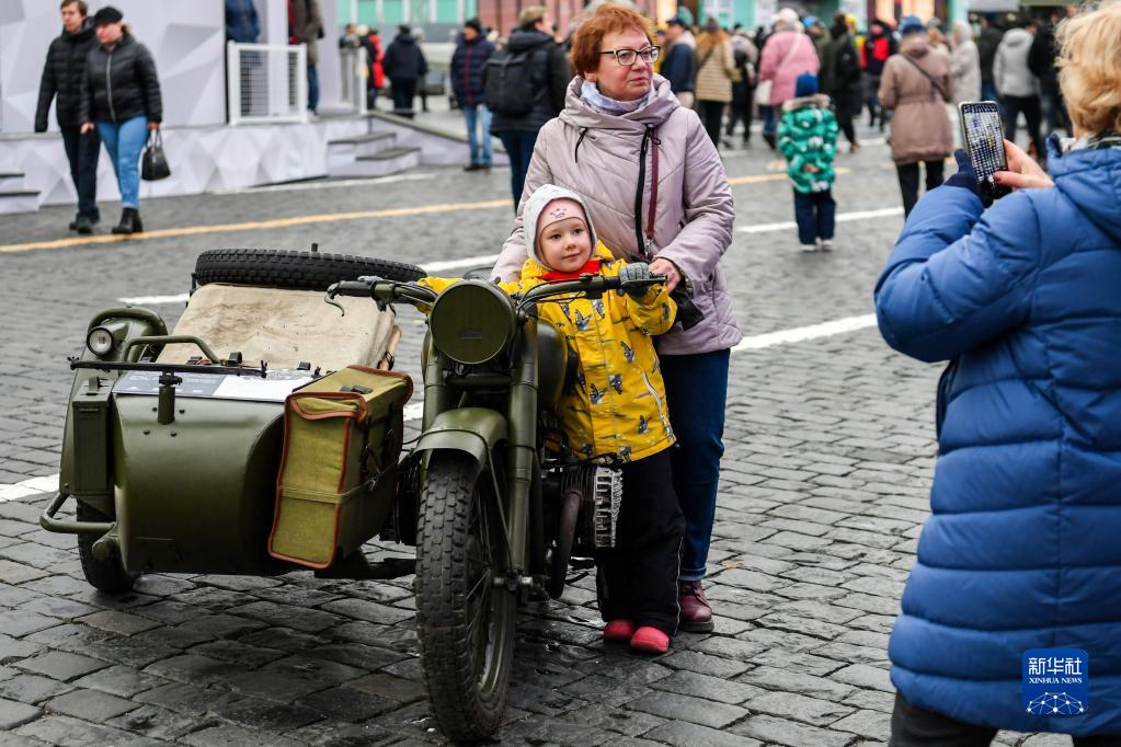 11月7日,在俄羅斯首都莫斯科,人們在以紀念1941年蘇聯(lián)紅場(chǎng)閱兵式為主題的露天展覽上拍照。