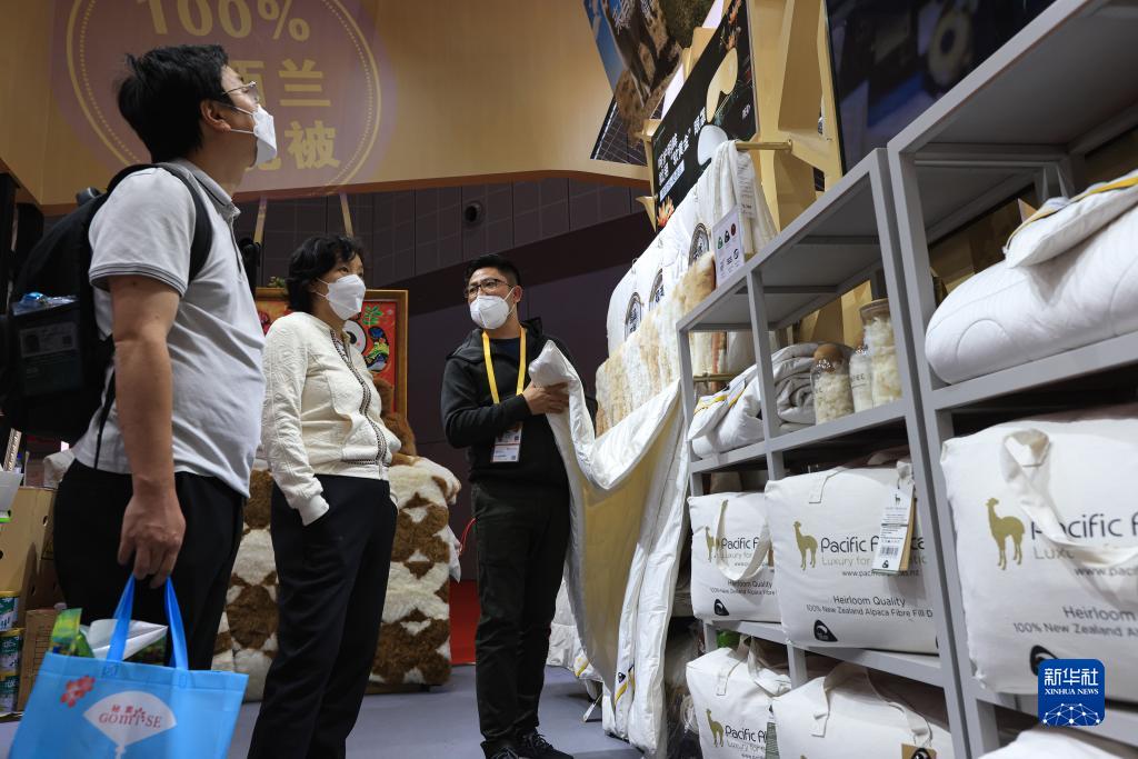 11月7日,在第五屆進(jìn)博會(huì )上,新西蘭太平洋羊駝集團公司工作人員(右)在展臺介紹羊駝被。