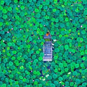 這是山東省濟寧市微山湖南陽(yáng)島濕地景色(無(wú)人機照片,2021年6月20日攝)。