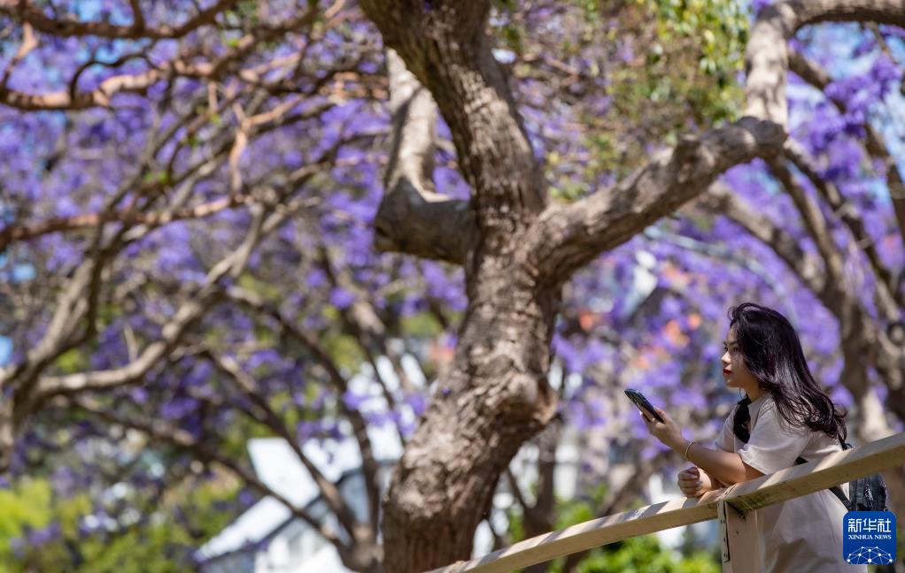 11月8日,在澳大利亞悉尼,一名女子在藍花楹樹(shù)下休息。