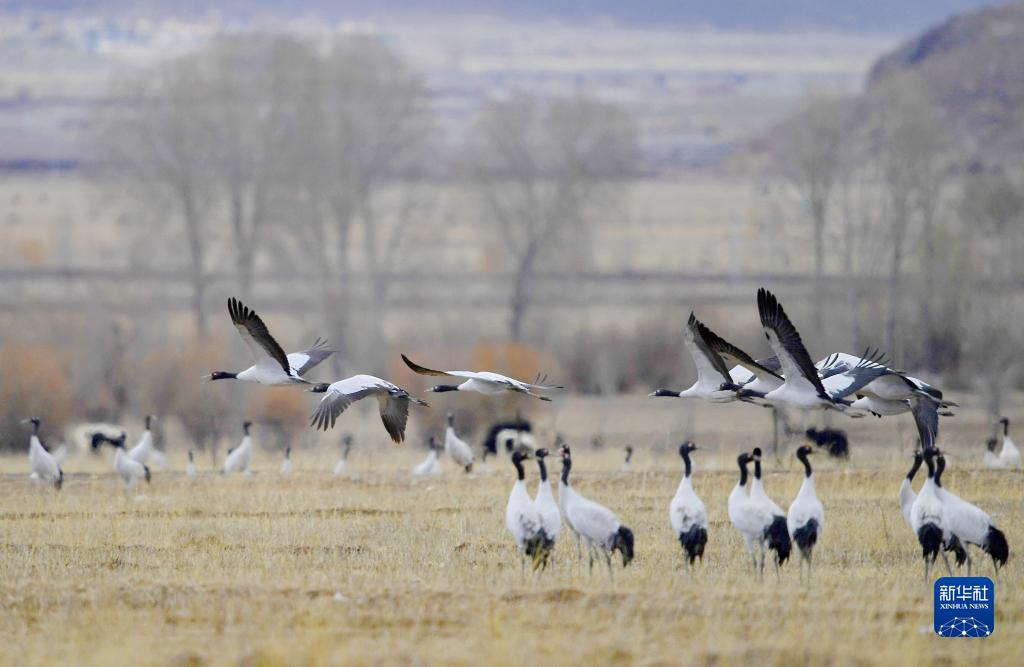 林周縣強嘎鄉田野里的黑頸鶴(11月6日攝)。
