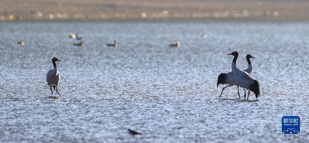 在林周縣虎頭山水庫拍攝的黑頸鶴(11月6日攝)。