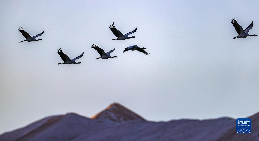 黑頸鶴在林周縣虎頭山水庫上空飛翔(11月6日攝)。