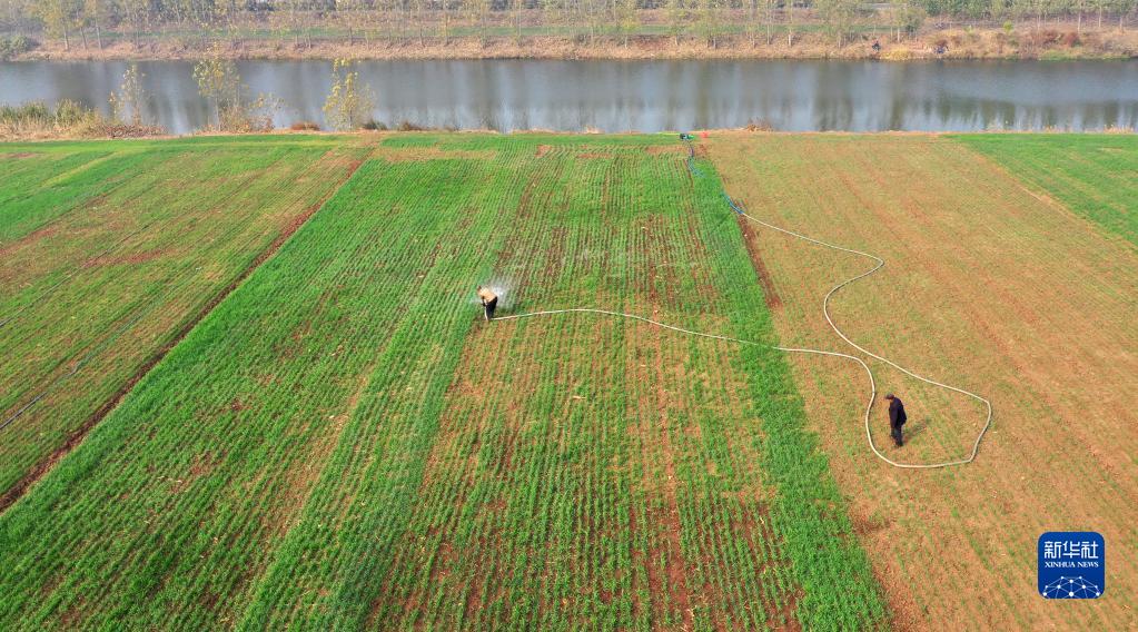 11月8日,山東省臨沂市郯城縣郯城街道農民在麥田間澆水(無(wú)人機照片)。