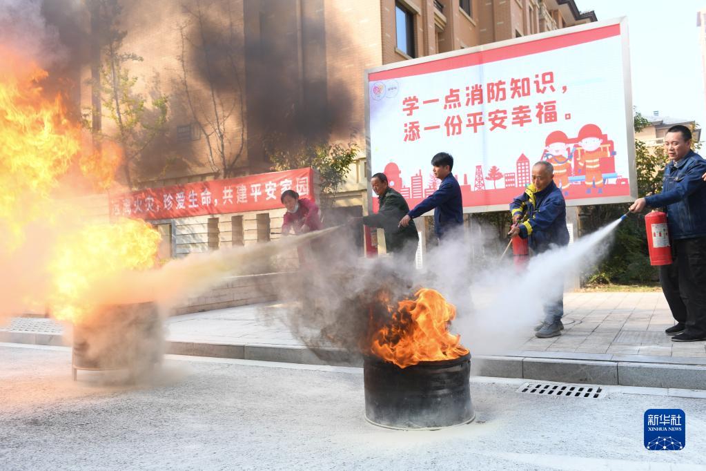 11月8日,在湖州市吳興區環(huán)渚街道一個(gè)居民區,消防和應急部門(mén)工作人員指導居民熟悉滅火器的操作方式。