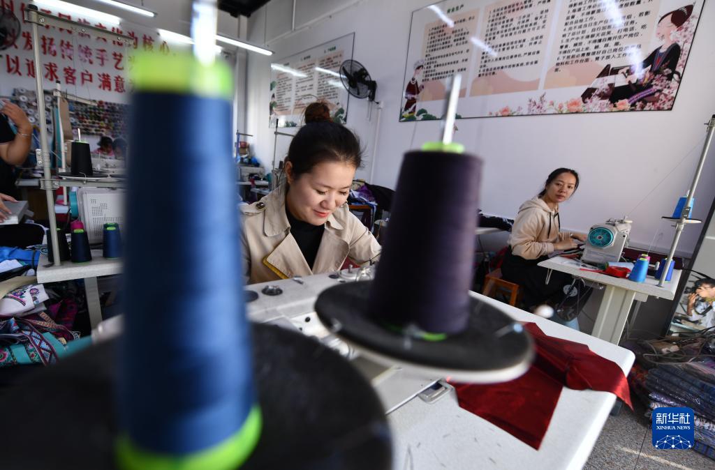 在廣西融水苗族自治縣一家苗繡生產(chǎn)基地,繡娘在制作刺繡產(chǎn)品(11月8日攝)。近年來(lái),在粵桂協(xié)作的幫扶下,苗繡文化得到進(jìn)一步挖掘、傳承和發(fā)展。