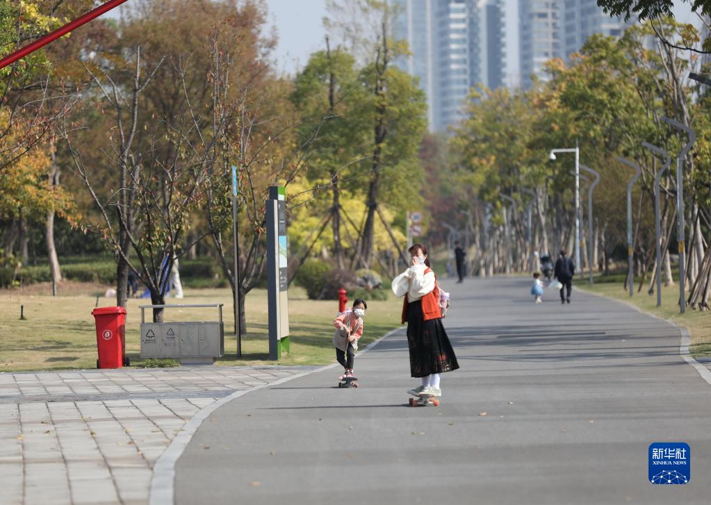 11月7日,市民在湖北武漢青山江灘玩滑板。