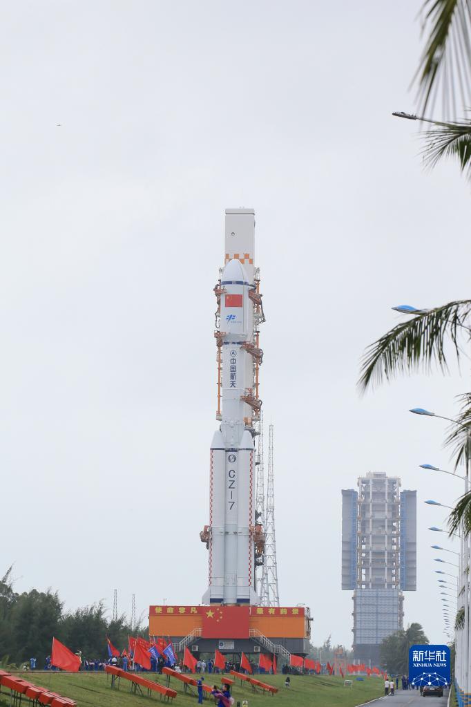 11月9日,天舟五號貨運飛船與長(cháng)征七號遙六運載火箭組合體在垂直轉運中。