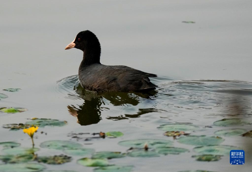 11月7日,在重慶市梁平區雙桂湖國家濕地公園,一只白骨頂雞在湖面游蕩。