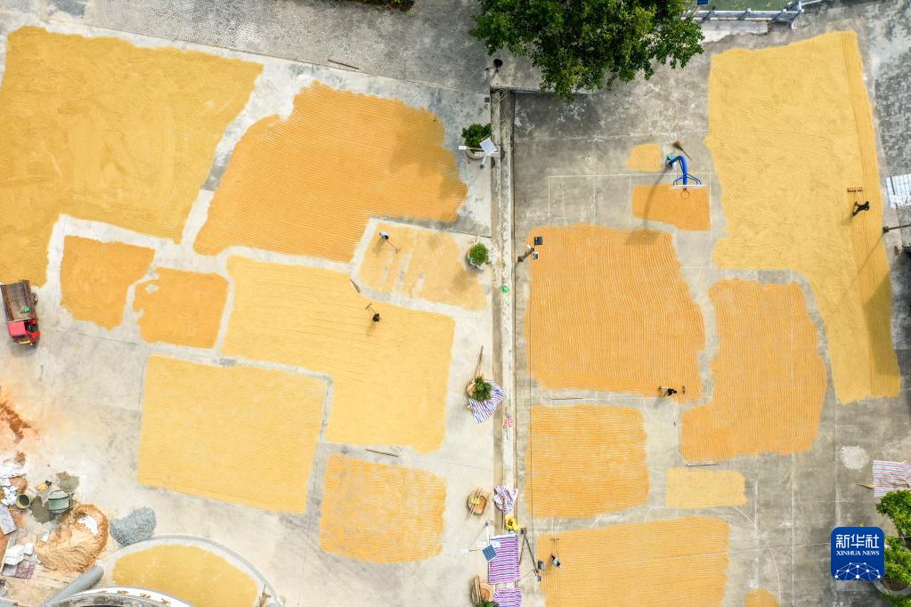 11月9日,在興業(yè)縣葵陽(yáng)鎮葵聯(lián)村,村民將收獲的稻谷攤開(kāi)晾曬(無(wú)人機照片)。
