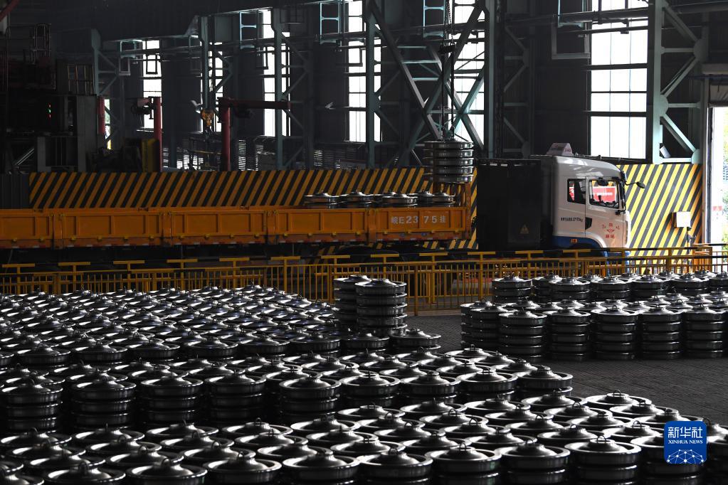 11月8日,在位于安徽省馬鞍山市的中國寶武馬鋼軌交材料科技有限公司數字車(chē)輪智慧工廠(chǎng),機械設備在吊運成品車(chē)輪。