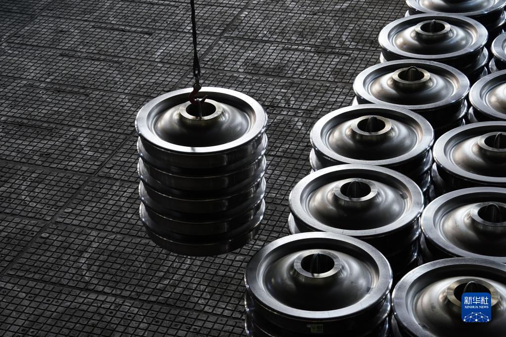這是11月8日在位于安徽省馬鞍山市的中國寶武馬鋼軌交材料科技有限公司數字車(chē)輪智慧工廠(chǎng)內拍攝的成品車(chē)輪。