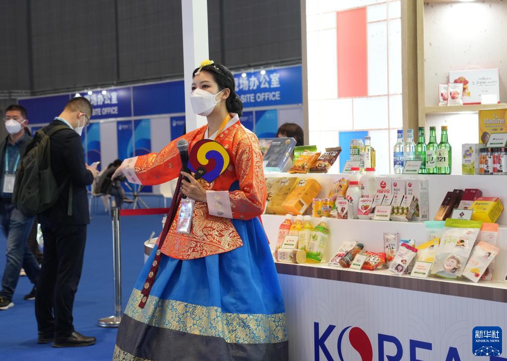 11月7日,第五屆進(jìn)博會(huì )韓國食品展臺工作人員在現場(chǎng)接待觀(guān)眾。