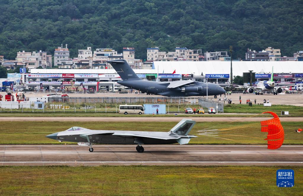 在第十四屆中國航展上,殲-20(前)降落珠海機場(chǎng)后從運油-20前滑過(guò)(11月8日攝)。新華社記者 劉大偉 攝