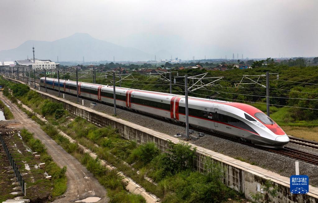 11月9日,在印度尼西亞西爪哇省萬(wàn)隆市,一列高鐵動(dòng)車(chē)組正在雅萬(wàn)高鐵試驗段進(jìn)行熱滑試驗。