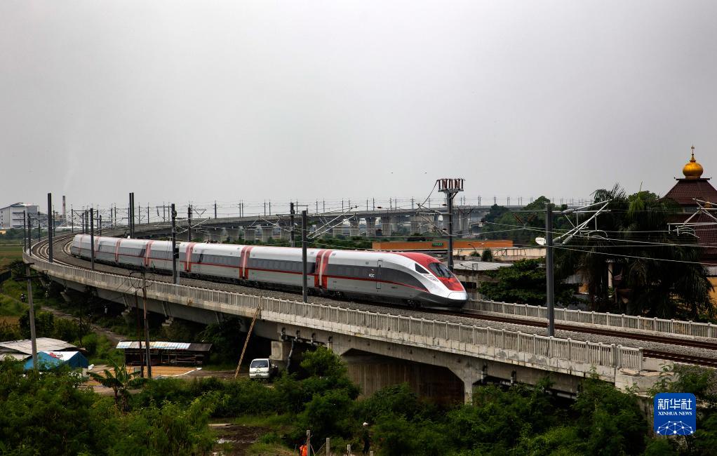 11月9日,在印度尼西亞西爪哇省萬(wàn)隆市,一列高鐵動(dòng)車(chē)組正在雅萬(wàn)高鐵試驗段進(jìn)行熱滑試驗。
