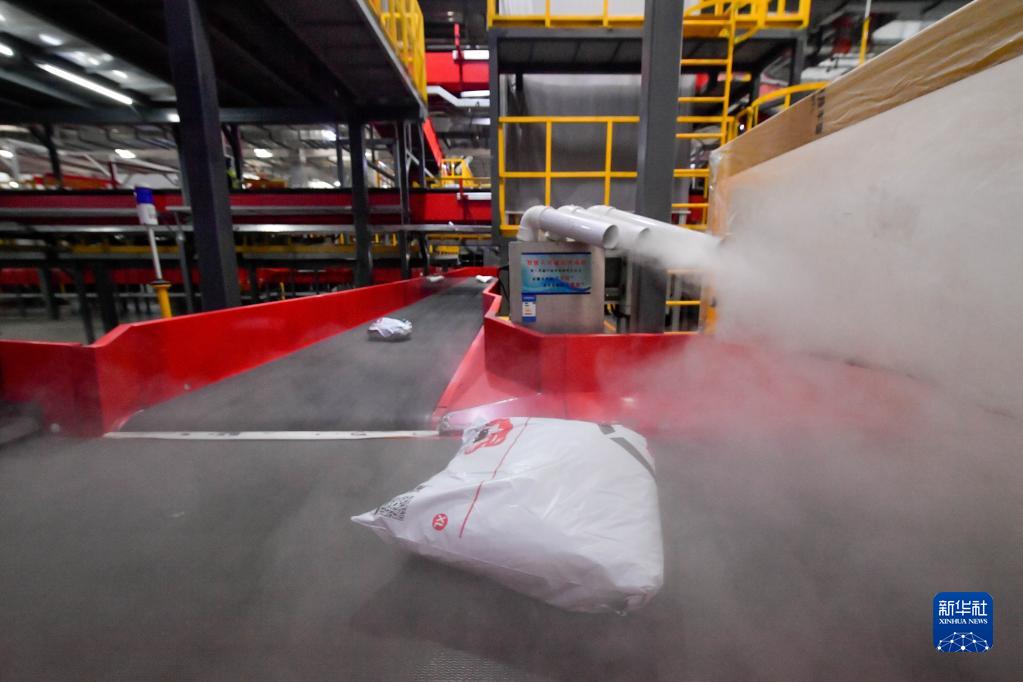 11月9日,在順豐速運天津全自動(dòng)中轉樞紐,霧化消殺設備對快遞包裹進(jìn)行消殺。