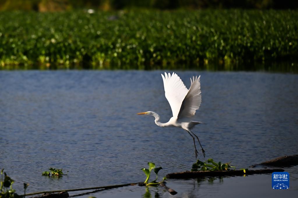 在墨西哥首都墨西哥城霍奇米爾科生態(tài)公園,一只白鷺展翅飛翔(2022年11月2日攝)。
