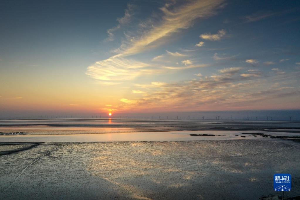 鹽城東臺條子泥濕地日出景象(11月9日攝,無(wú)人機照片)。