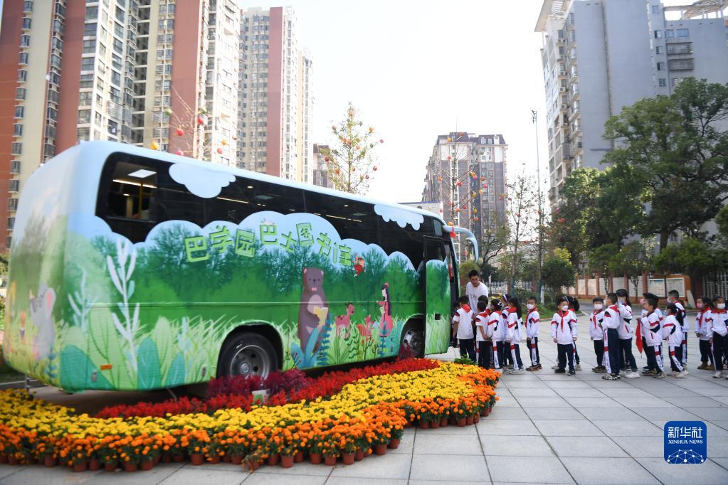 11月10日,長(cháng)沙市青園友誼小學(xué)的學(xué)生排隊進(jìn)入巴士圖書(shū)館。
