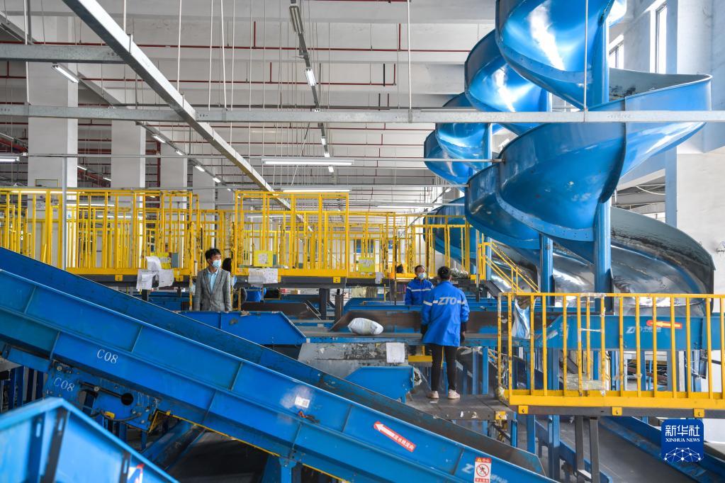 11月10日,工作人員在位于貴州省龍里縣的貴州快遞物流園一家快遞分撥中心分揀快遞。