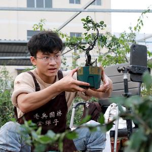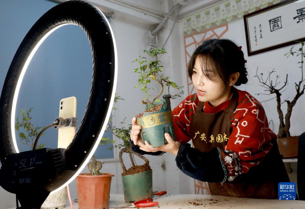 11月10日,四川省華鎣市明月鎮一家園林的工作人員利用手機直播銷(xiāo)售盆景。