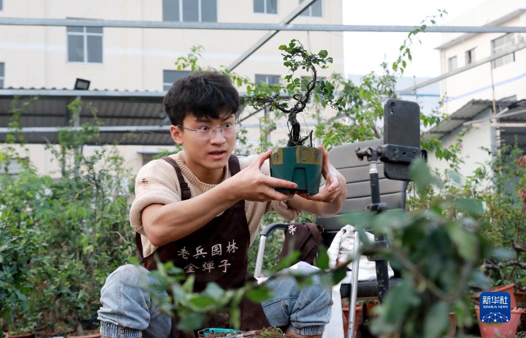 11月10日,四川省華鎣市明月鎮一家園林的工作人員利用手機直播銷(xiāo)售盆景。