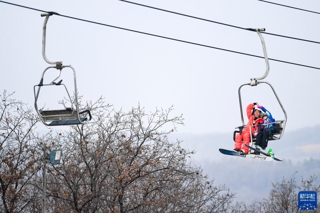 11月11日,滑雪愛(ài)好者乘坐廟香山滑雪場(chǎng)纜車(chē)。