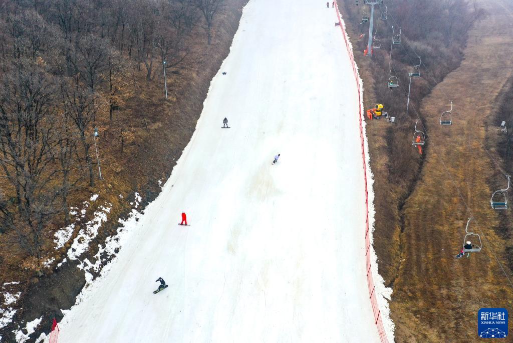 11月11日,滑雪愛(ài)好者在長(cháng)春市廟香山滑雪場(chǎng)滑雪(無(wú)人機照片)。