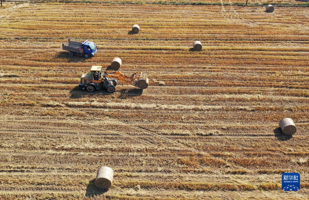 在南昌縣廣福鎮,農民在回收稻田里的秸稈(11月10日攝,無(wú)人機照片)。