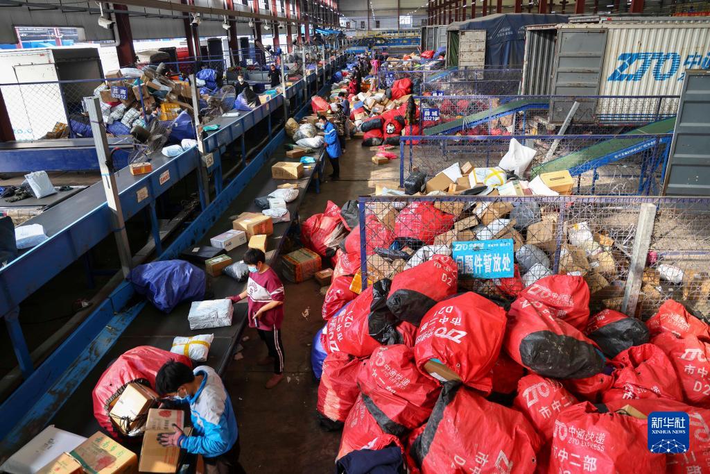 11月11日,在山東省臨沂市蘭山經(jīng)濟開(kāi)發(fā)區國際陸港智慧物流園內,工作人員在分揀快遞。