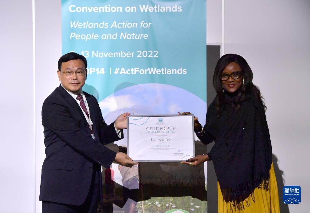 11月10日,在瑞士日內瓦,《濕地公約》秘書(shū)長(cháng)蒙巴(右)為中國重慶梁平頒發(fā)“國際濕地城市”認證證書(shū)。
