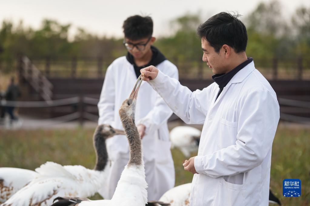 保護區馴養員姜官宏(右)和蔡新杰與人工繁育的丹頂鶴互動(dòng)(11月8日攝)。