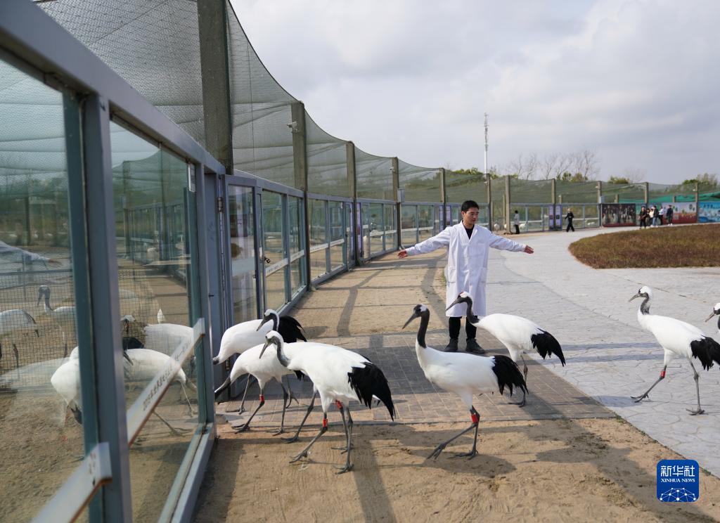 保護區馴養員姜官宏將放飛結束的人工繁育的丹頂鶴帶進(jìn)鶴舍(11月8日攝)。