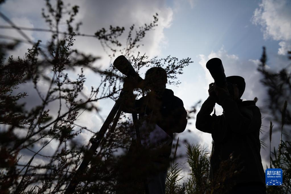 保護區科研人員李征浩(左)和趙永強在開(kāi)展鳥(niǎo)類(lèi)多樣性調查和監測(11月8日攝)。