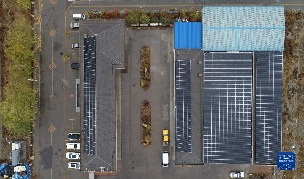 經(jīng)過(guò)“零碳化”改造后的國網(wǎng)寧夏電力石嘴山供電公司長(cháng)勝供電所全景(11月11日攝,無(wú)人機照片)。