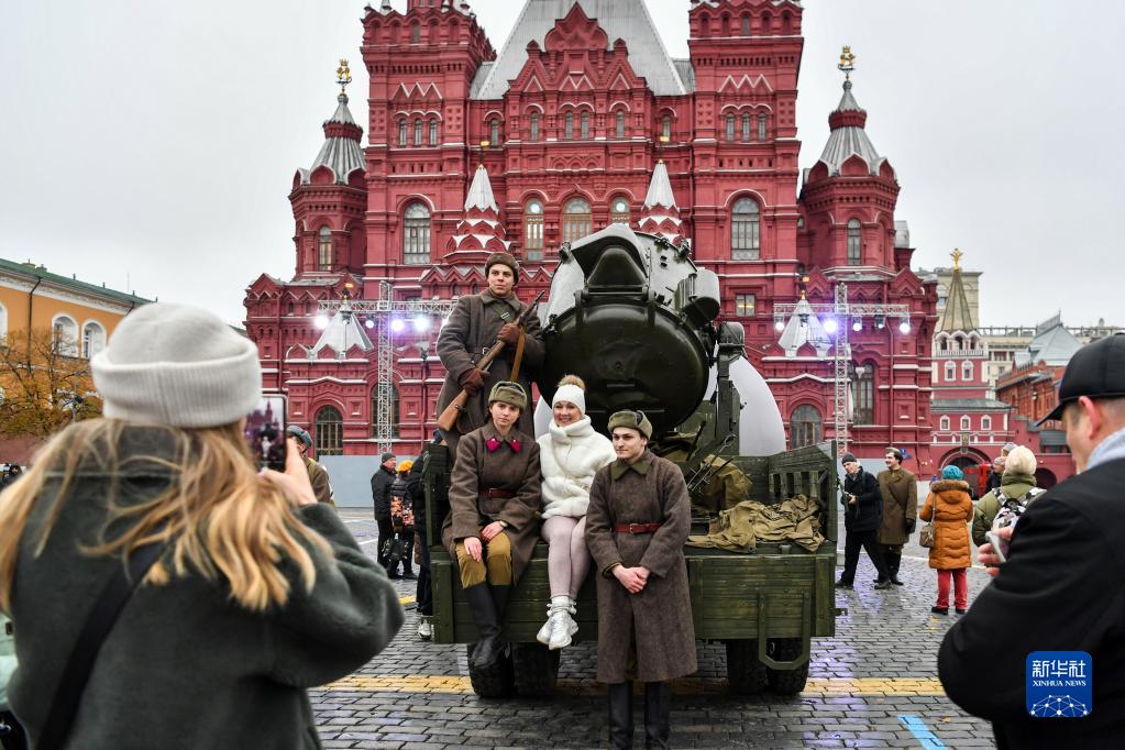 11月7日,在俄羅斯首都莫斯科,人們在以紀念1941年蘇聯(lián)紅場(chǎng)閱兵式為主題的露天展覽上拍照。