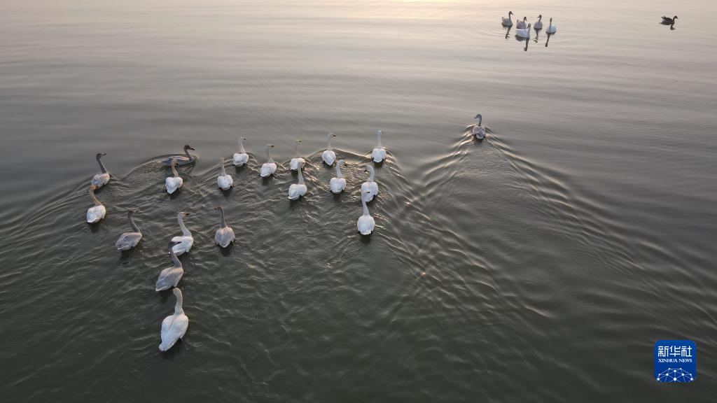 一群候鳥(niǎo)在合肥市肥西縣的巢湖湖面停留(無(wú)人機照片,2022年11月9日攝)。
