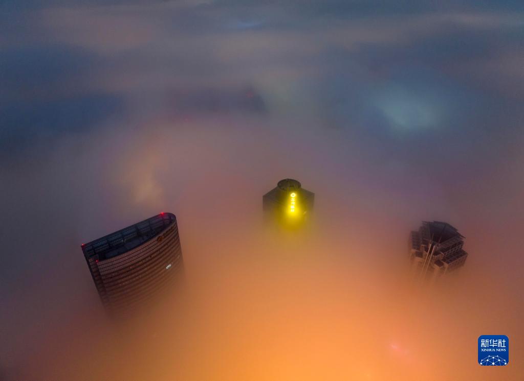 江蘇省淮安市的建筑在大霧中若隱若現(11月10日攝,無(wú)人機照片)。