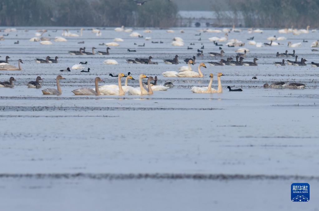 11月11日,天鵝等鳥(niǎo)類(lèi)在廬江縣黃陂湖棲息。