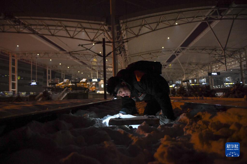 11月13日,在長(cháng)春火車(chē)站,中國鐵路沈陽(yáng)局集團有限公司長(cháng)春高鐵基礎設施段工作人員清理鐵軌設備附近的冰雪。
