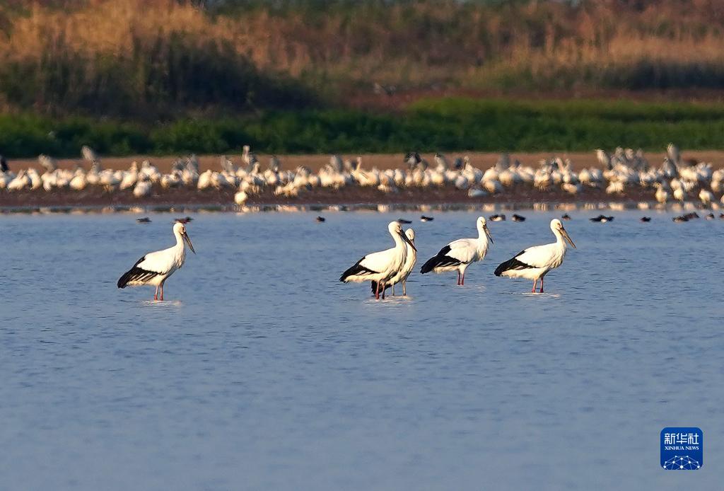 11月11日,東方白鸛等候鳥(niǎo)在江西鄱陽(yáng)湖南磯濕地國家級自然保護區的濕地棲息。