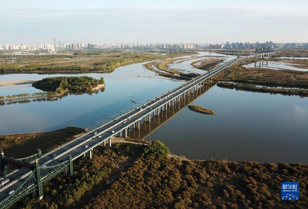 哈爾濱陽(yáng)明灘大橋和附近濕地(9月26日攝,無(wú)人機照片)。