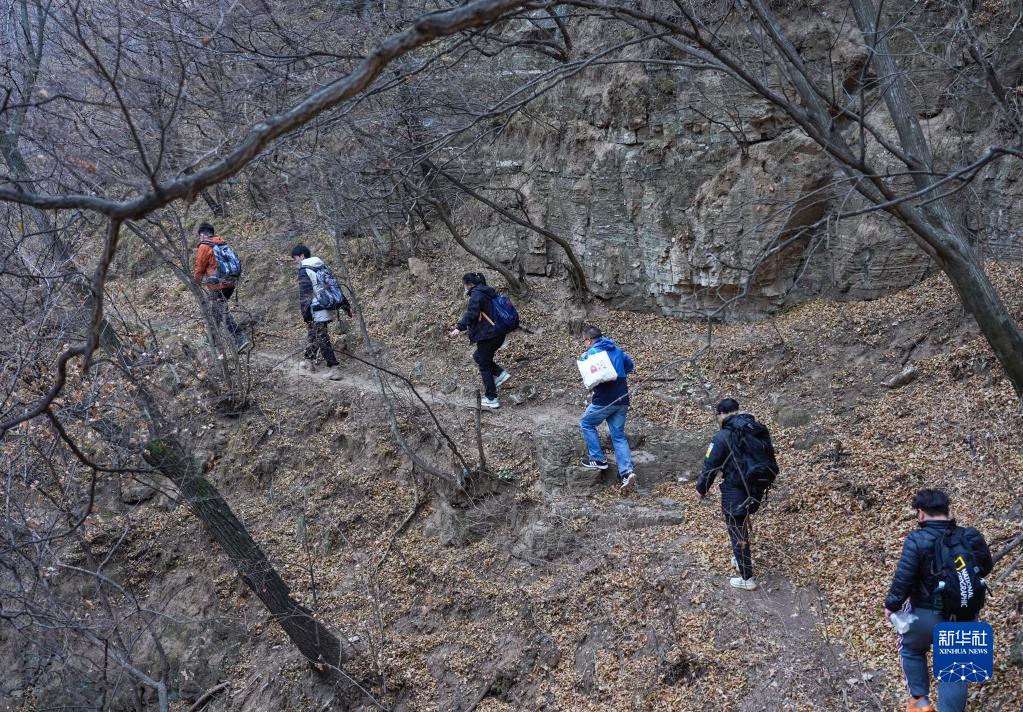 趙明騰(右三)和同事們走在深山中(11月9日攝)。